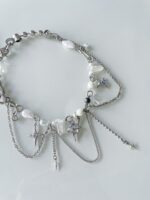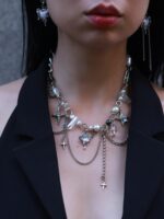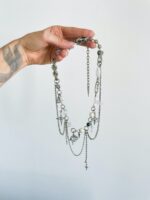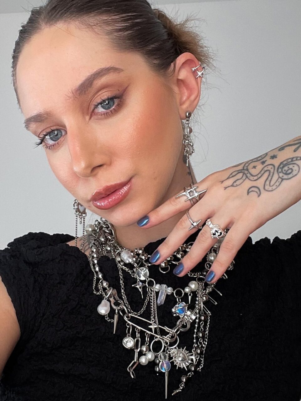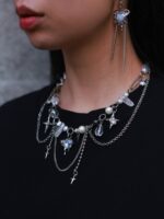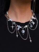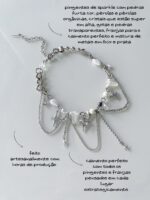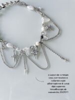 Um dos colares mais lindos e preciosos que já tivemos aqui. Ele é feito artesanalmente com horas de produção e elementos escolhidos um a um dentro das maiores tendências do momento. Ele tem esse mood futurista e místico ao mesmo tempo, com cristais que estão super em alta e mais detalhes que deixam ele ainda mais incrível: diferentes elos de correntes como a corrente bubble e pequenas franjas com o caimento perfeito no corpo, uma mistura de pérolas orgânicas com os cristais que já mencionamos, pingentes de brilho furta cor, sparkles, coração lisérgico furta cor com ponto de luz, pedrinhas reluzentes e bolas transparentes furta cor, além de spikes de diferentes tamanhos. Ele ainda pode ser usado mais curto ou mais comprido como choker ou colar e fica incrível com outros colares em um mix. Uma verdadeira joia, você não pode ficar sem!