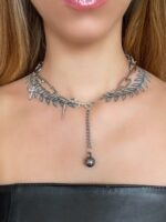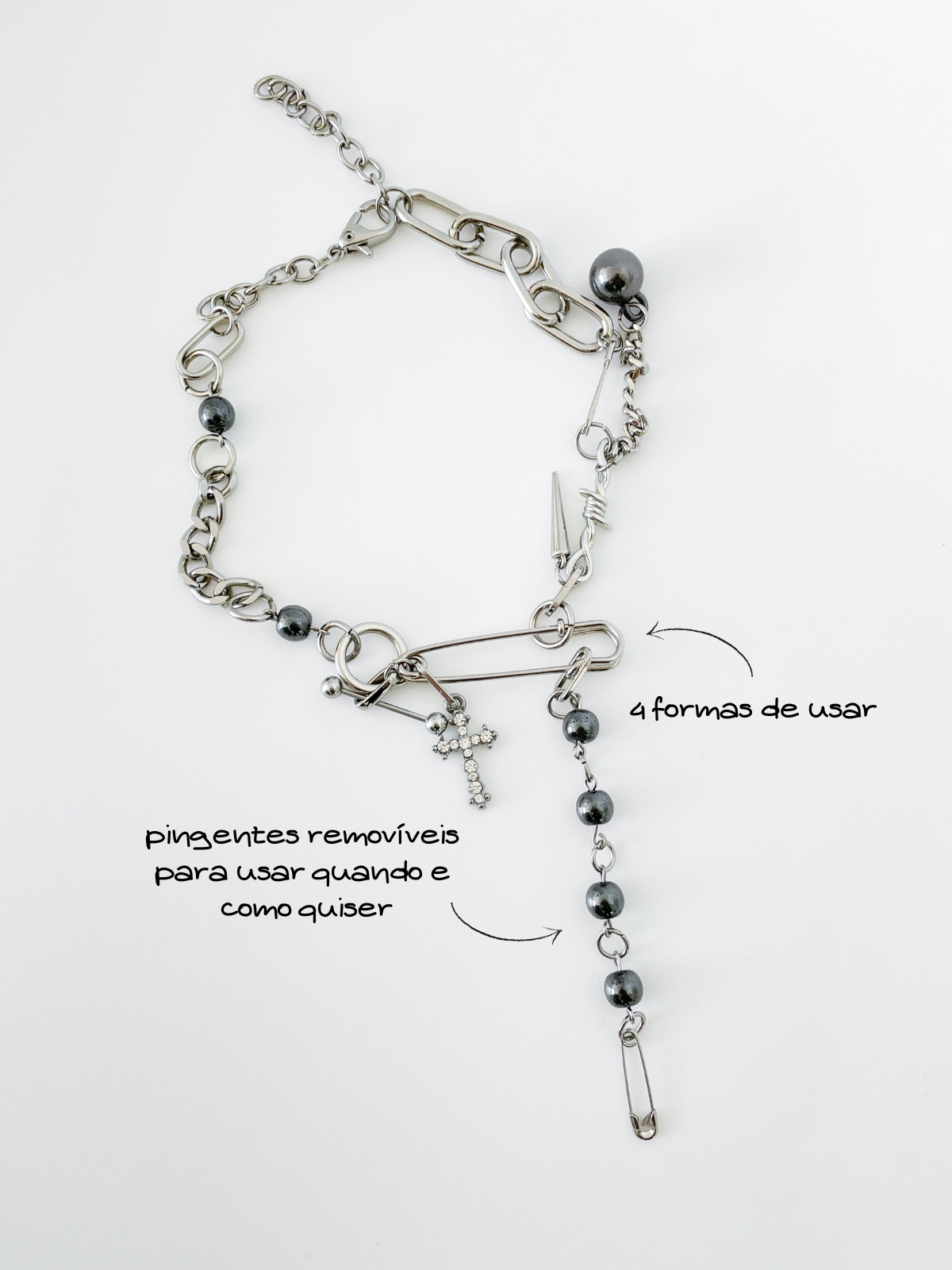 Mais uma peça mega versátil por aqui e você deve estar se perguntando: por que ela ainda não está aqui no meu pescoço? Pois é… essa novidade também quer logo te encontrar e mostrar as várias formas de usá-la: com a corrente de pérolas no centro, sem ela com o alfinete no centro e até com a grande bola de metal ônix no meio. Optamos por pingentes removíveis para você aproveitar ao máximo as variedades de estilos das nossas peças.