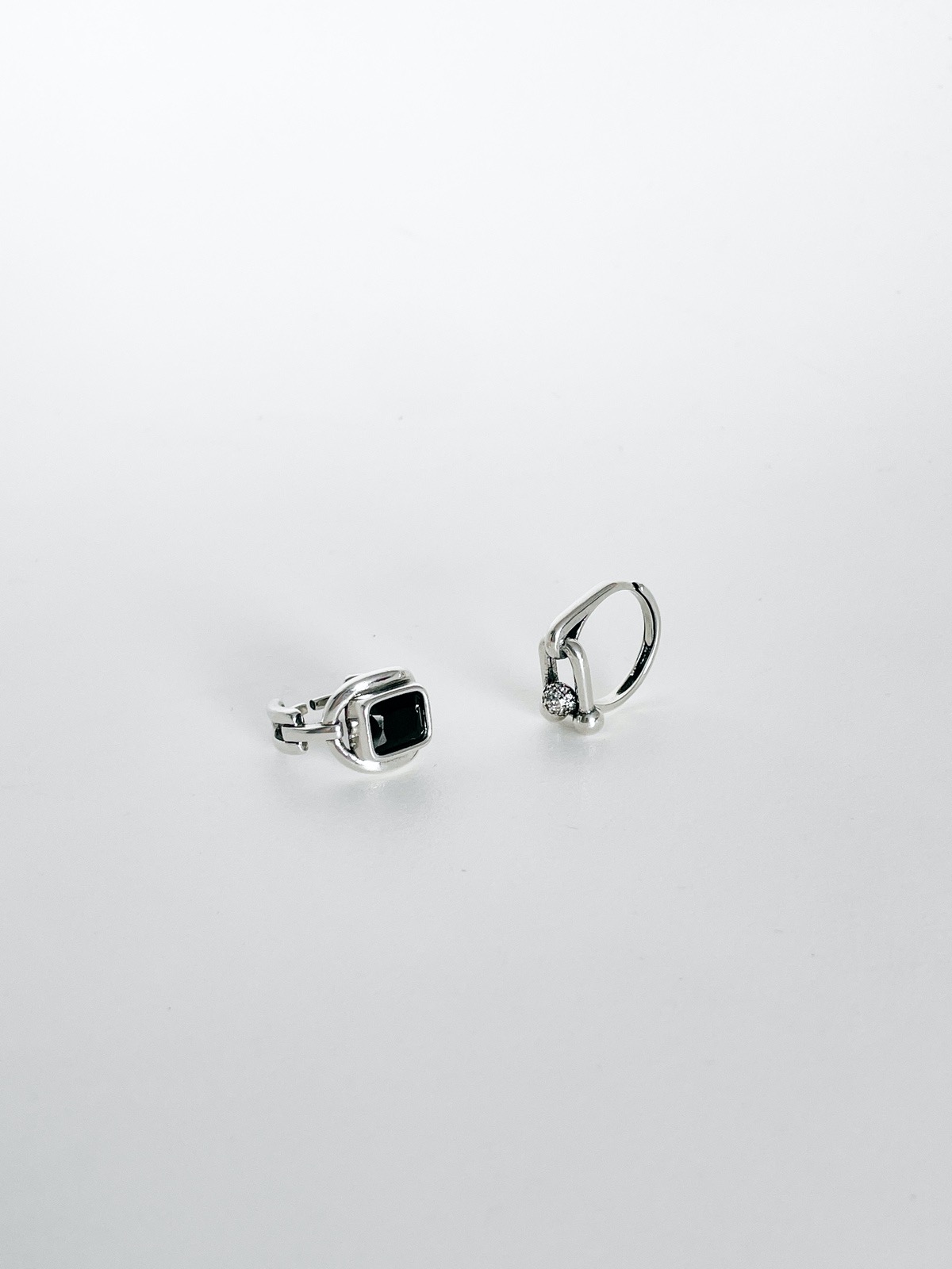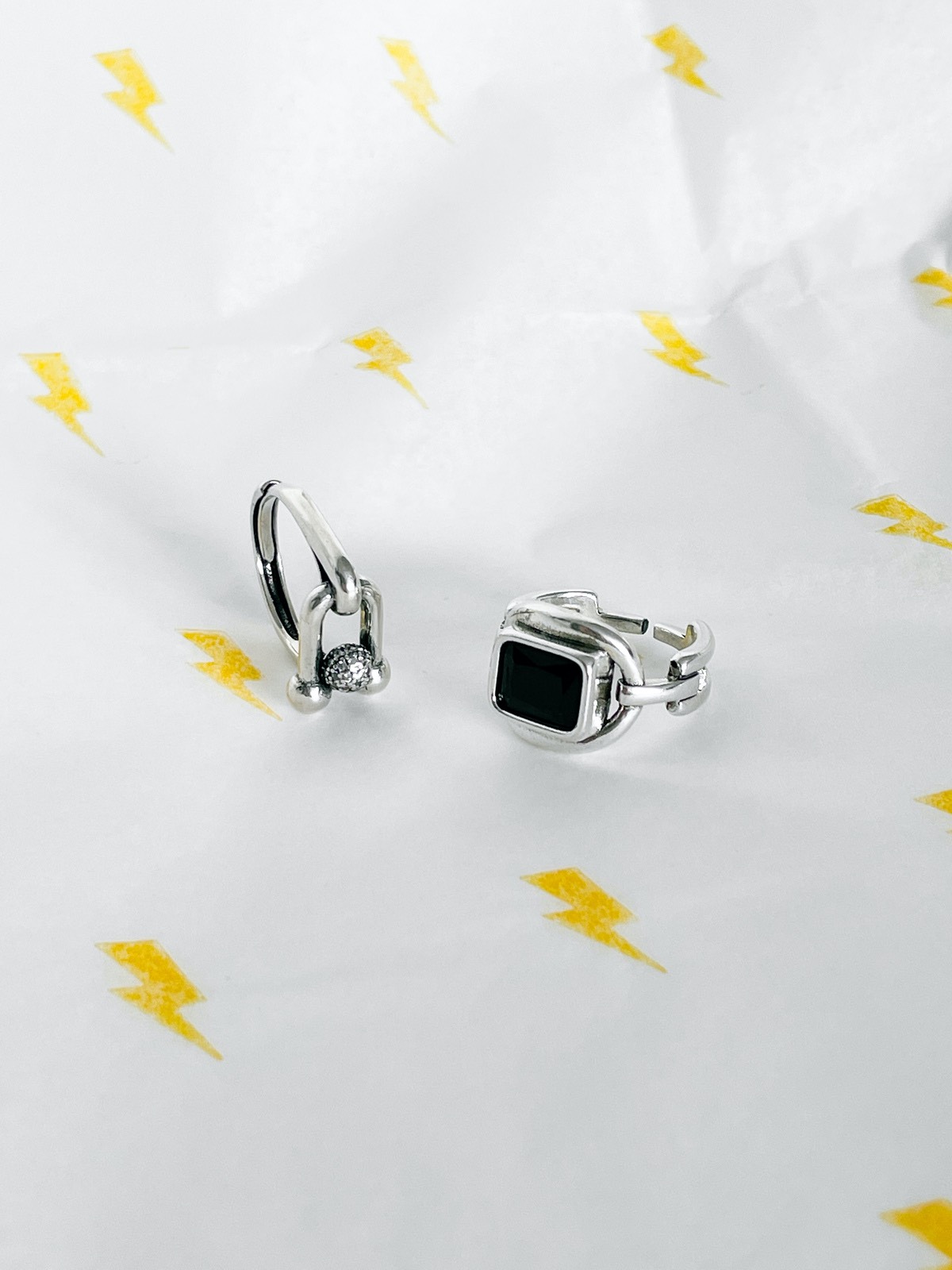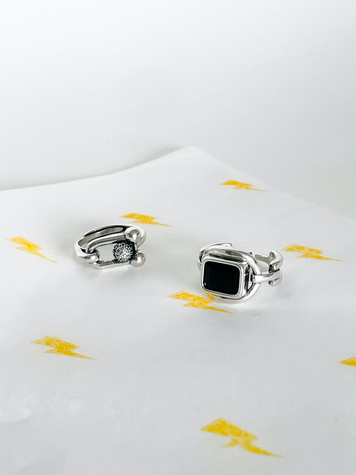 Duo Groovy, anéis com formato irregular, cristal preto e banho prata 925