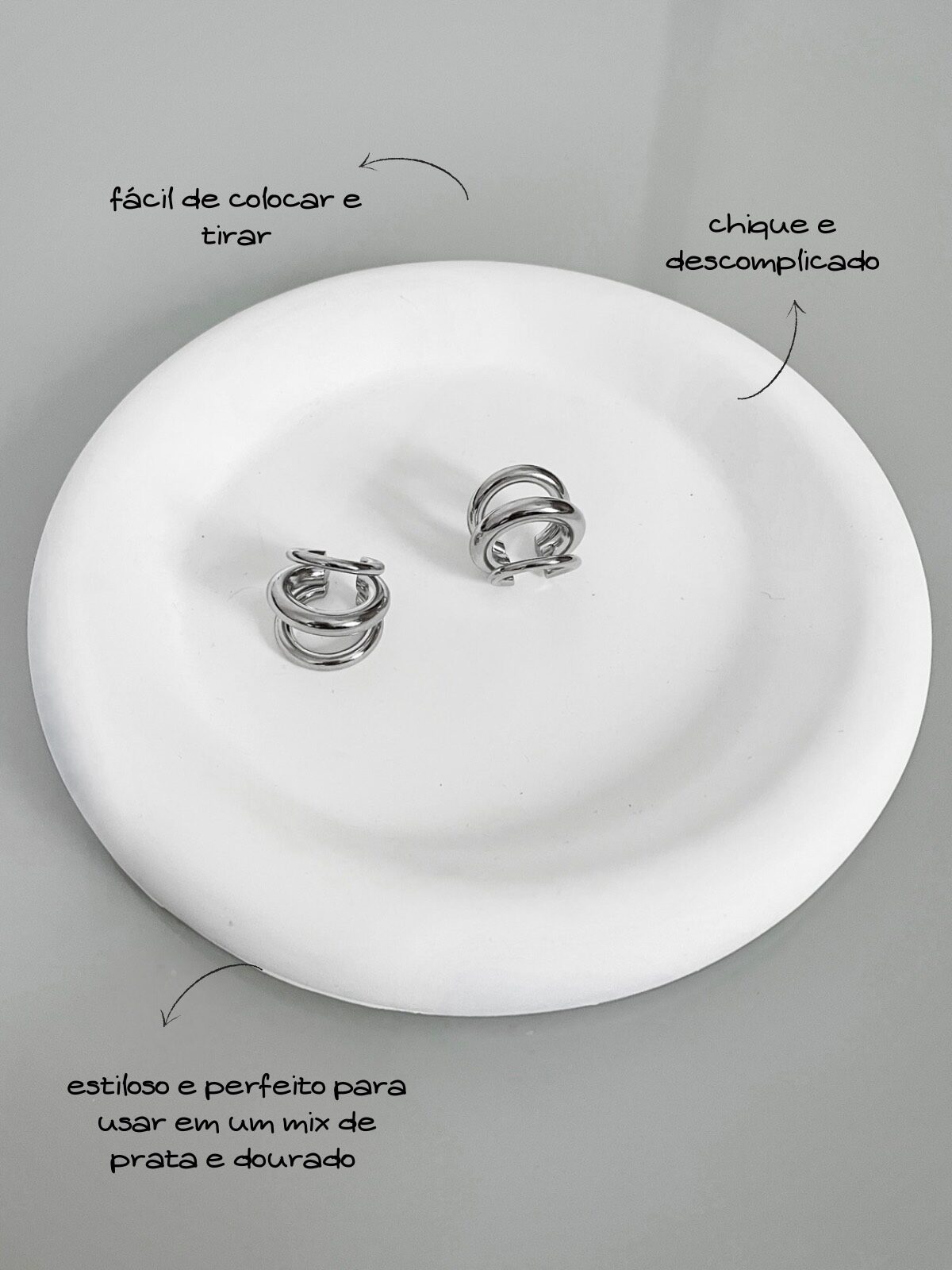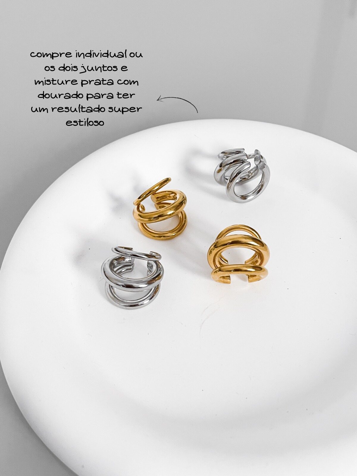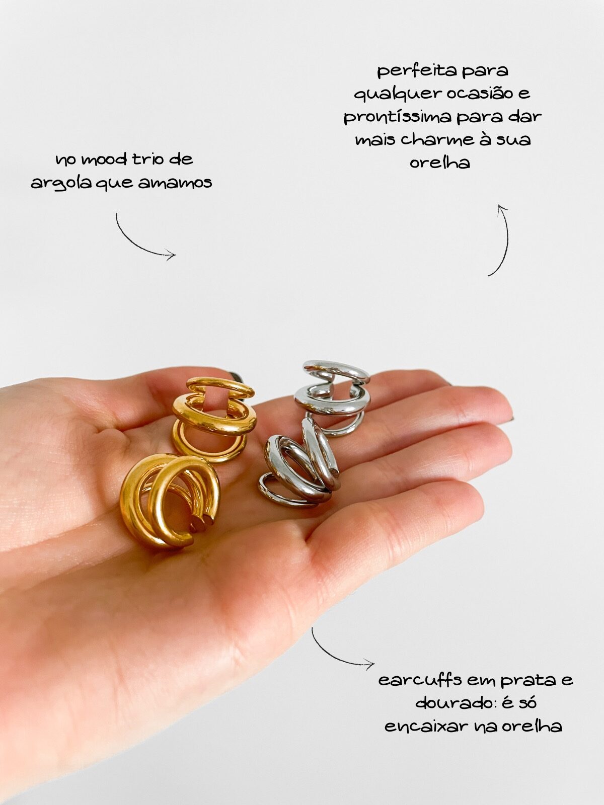 WOW! Esse ear cuff é ICÔNICO! Com design de três meia-argolas sobrepostas, ele cria um efeito moderno e estruturado que abraça a orelha com atitude. A peça tem acabamento prateado espelhado e é toda lisa, o que dá um ar minimalista com impacto — perfeita pra quem ama acessórios alternativos. Não precisa ter furo! É só encaixar e pronto: o look já ganha outro nível. Você pode usar mais pra cima na cartilagem ou mais embaixo, do jeito que preferir. Sozinha ele já brilha, mas também fica incrível em composição com outros brincos ou piercings. Ah, e diferente da maioria dos ear cuffs que vendem só uma unidade, essa aqui vem o par. Porque estilo nunca é demais. Enjoy!