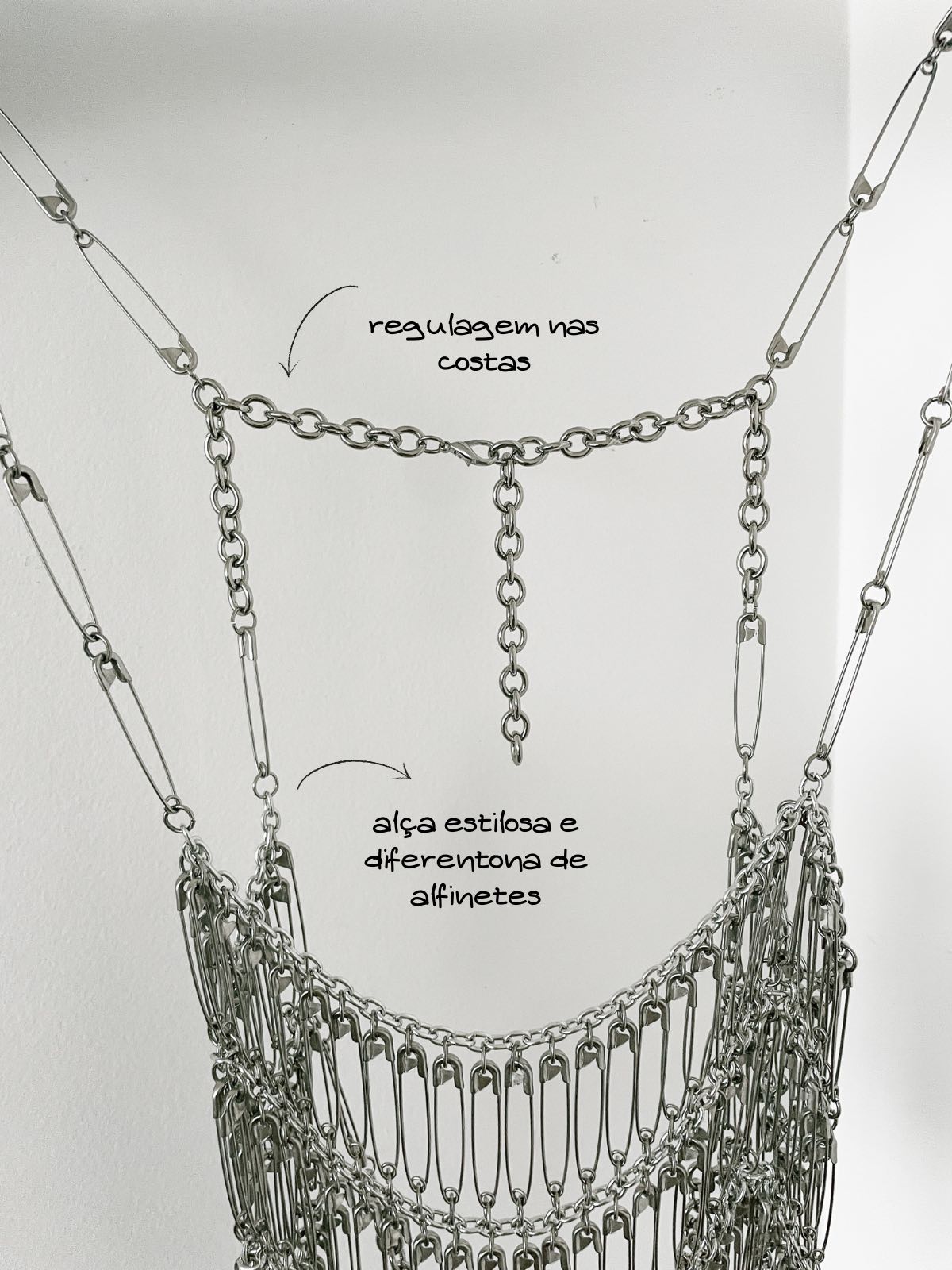 Top Lunatik, o top mais perfeito que você precisa ter! Todo artesanal, feito com muitos alfinetes e corrente prata